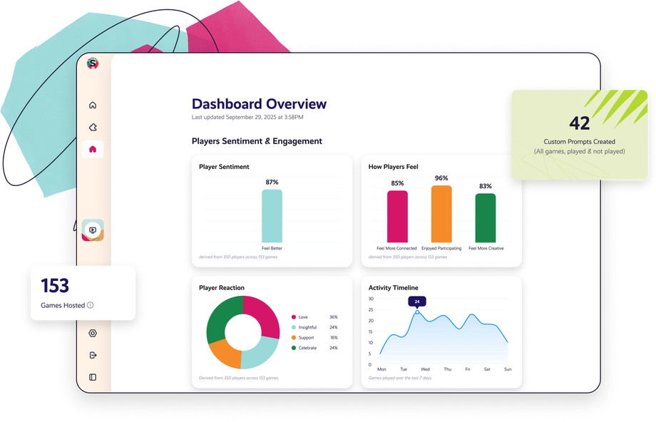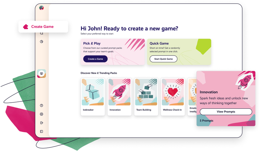 Pick a prompt pack or create your own custom questions. No prep required — hosts can launch a session in under 2 minutes.